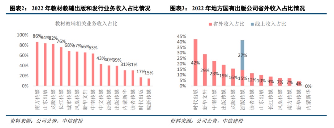 从收入结构看,在地方教育出版公司中,教材教辅出版与发行业务的合计收入贡献约占一半,且通常是毛利率最高的业务之一,约为20%以上。而教育作为国家发展的基础性服务,需求稳定,因此在教材教辅业务基础上,地方教育公司的业绩稳定性较高。以该行上述认为可以重点关注的凤凰传媒、中南传媒、浙版传媒和中文传媒为例,22年教材教辅相关收入占比分别为67.3%、63.5%、40.2%和43.0%。从22年扣非后归母净利润看,凤凰传媒、中南传媒、浙版传媒和中文传媒分别为30.64%、12.04%、8.66%和35.48%;23年上半年,公司归母净利润保持稳健增长,四家公司分别为3.62%、16.53%、6.59%和10.59%。