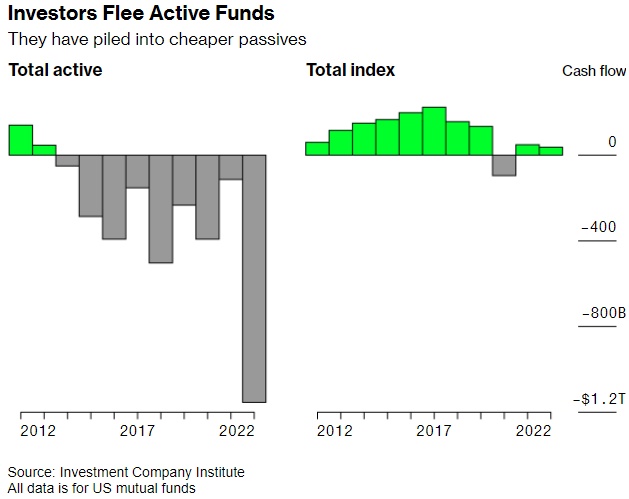 尽管他们希望,当形势变得艰难时,客户会重新选择股票和债券——并为此买单——但下行趋势似乎不可逆转。根据从资产管理公司收集的数据,无论市场是涨是跌,被动式产品都获得了如此大的吸引力,到今年年中,被动式产品占美国共同基金和ETF总资产的一半,高于2022年的47%和2021年的44%。十年前,这一比例仅为27%。