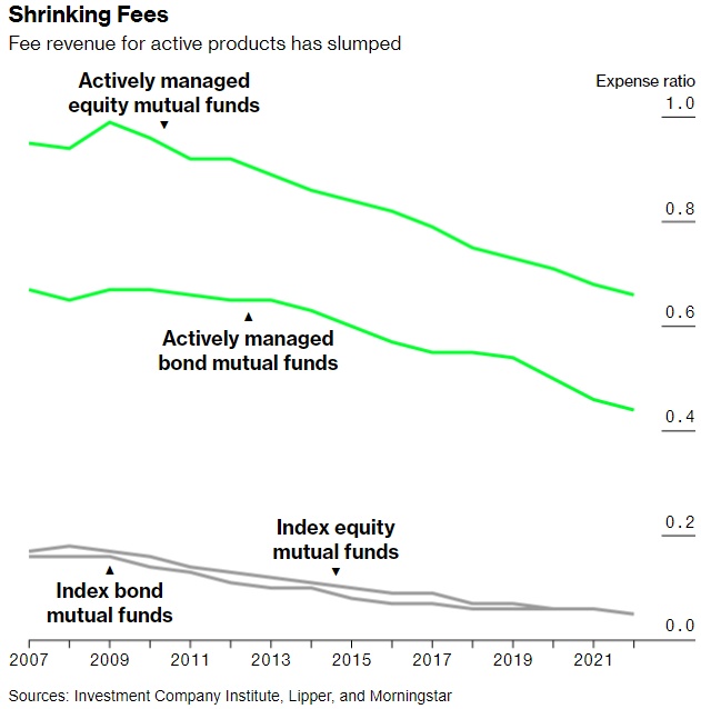这些公司陷入困境的原因已经不是什么秘密:投资者正在抛弃共同基金,转向成本低得多的被动策略,这些策略主要由贝莱德、先锋集团和道富银行等巨头管理,导致整个行业的费用大幅压缩,对规模较小的基金公司的收入和利润率造成了压力。