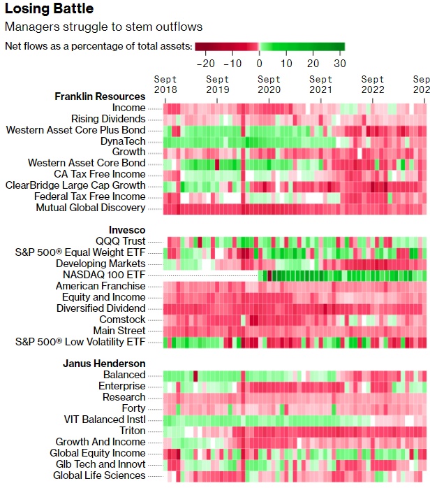 自2018年以来,富兰克林只有两个季度的长期净流入,即使在市场活跃和收购之后也是如此。在经历了连续21个季度的资金流出后,Janus Henderson今年早些时候迎来了第一季度的资金流入,但随后又开始流出。Abrdn自2017年通过合并创建以来,还没有经历过一年的净流入。自2021年年中以来,普信集团的基金已经流出数百亿美元,其管理费收入下降了15%以上。而景顺在过去三年中几乎没有收入增长。