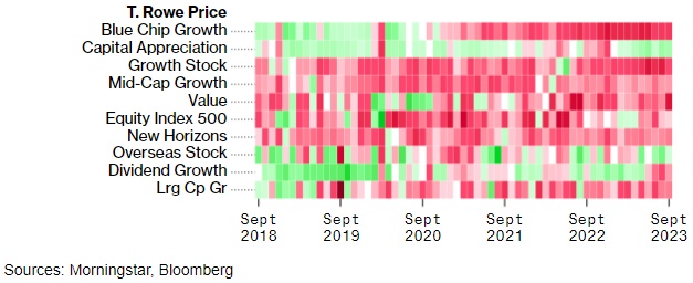 其他公司的情况也类似。例如,晨星公司的数据显示,富兰克林拥有75年历史的收入基金(Income Fund)总资产约为690亿美元,但在五年内净流出约190亿美元。其总资产约为210亿美元的西部资产核心+债券基金自2022年初以来已赎回逾100亿美元。自2022年初以来,普信集团旗下270亿美元的中型股增长基金(Mid-Cap Growth Fund)和500亿美元的蓝筹股增长基金(Blue Chip Growth Fund)出现了数十亿美元的资金外流和资产缩水。