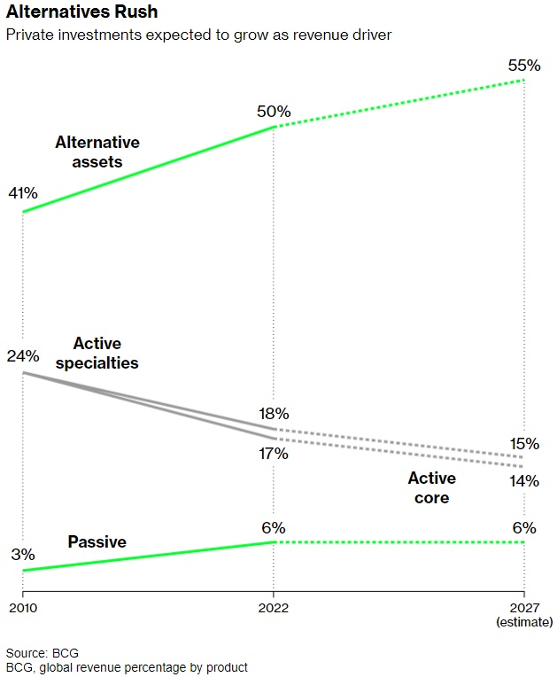 德意志银行旗下资产管理公司DWS的首席执行官Stefan Hoops表示:“在过去10年里,超过100%的收入增长都是由市场表现驱动的——只是市场在上涨。”DWS是德银旗下9000亿美元资产管理公司,他去年接管了这家公司,并一直在向ETF和另类投资基金投入资金,以应对压力。“现在想象一下,如果市场横盘震荡,但利润率受到同样程度的压缩,那么突然之间,你可能会面临10年的收入萎缩。”