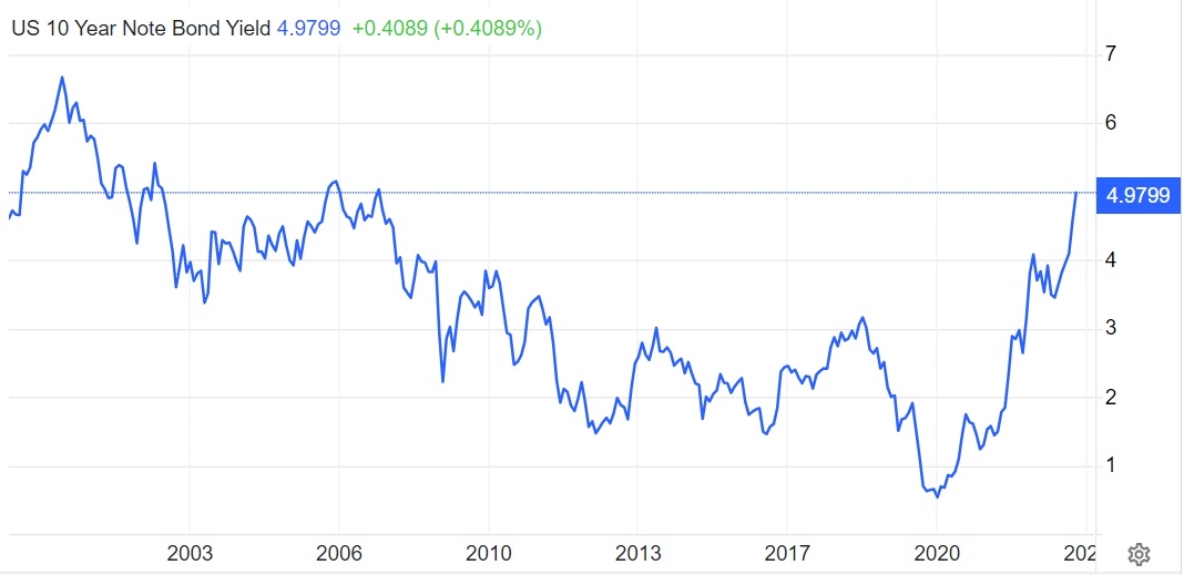 过去一个月,有着“全球资产定价之锚”称号的10年期美国国债收益率升至16年来的最高位,一度升破5%,重创包括股股票、公司债券在内的全球风险资产,加之围绕美联储本轮加息周期何时完结、5%以上的高利率将维持多久等不确定性因素令全球股市承压。