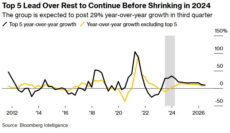 其中,前5大科技公司利润增幅将继续领先于其他标普成分公司——预计第三季度将实现29%的同比增幅