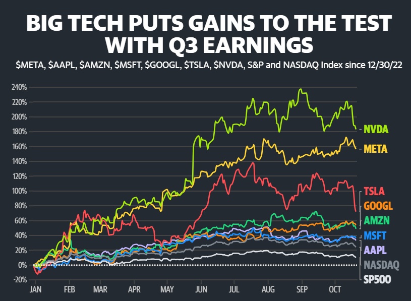 在极大程度上推动了2023年美股上涨的“美股七大科技巨头”(Magnificent Seven)中,有四大科技巨头本周将提供最新的季度财报,为可能影响美股三大指数的整体股票走势奠定基础。特斯拉上周已公布财报,苹果将于下周公布财报,英伟达财报则预计将于11月下旬公布。