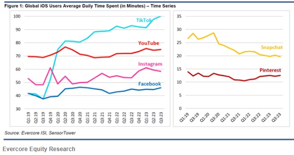 其次,YouTube在第三季度的表现也很不错。根据Evercore的数据,与各自的2022年基准相比,YouTubeDAU和DAU参与度都出现了大幅上升。