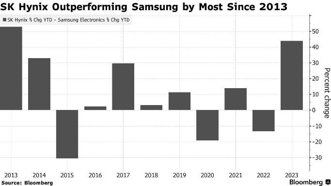 智通财经APP获悉,三星电子的股价表现将落后于规模较小的存储芯片竞争对手SK海力士,落后幅度为10年来之最,因为投资者押注后者将成为人工智能领域的赢家。