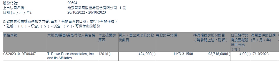 智通财经APP获悉,香港联交所最新资料显示,10月17日,T. Rowe Price Associates, Inc. and its Affiliates减持北京首都机场股份(00694)42.4万股,每股作价3.15港元,总金额约为133.56万港元。减持后最新持股数目约为9371.80万股,最新持股比例为4.99%。