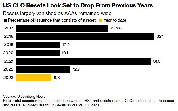 在CLO市场表现低迷之际,许多CLO管理公司也陷入困境。需求下降使得它们难以对现有证券进行再融资。在以前的好日子里,一些经理通常会寻求重置现有的贷款组合以延长还款期限,但如今,CLO的投资者更希望关闭或赎回CLO。