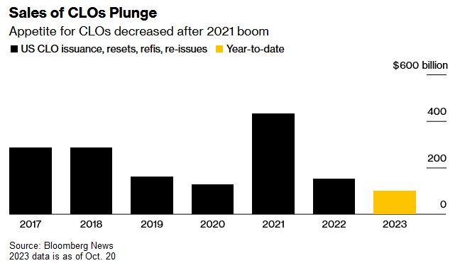 美联储尚未准备好转向的姿态令华尔街的希望破灭,并导致一揽子企业融资计划再次陷入停滞。作为CLO抵押品的贷款通常是由负债累累的公司发行的,但这些公司在加息背景下尤其容易受到成本和利率上升的影响。