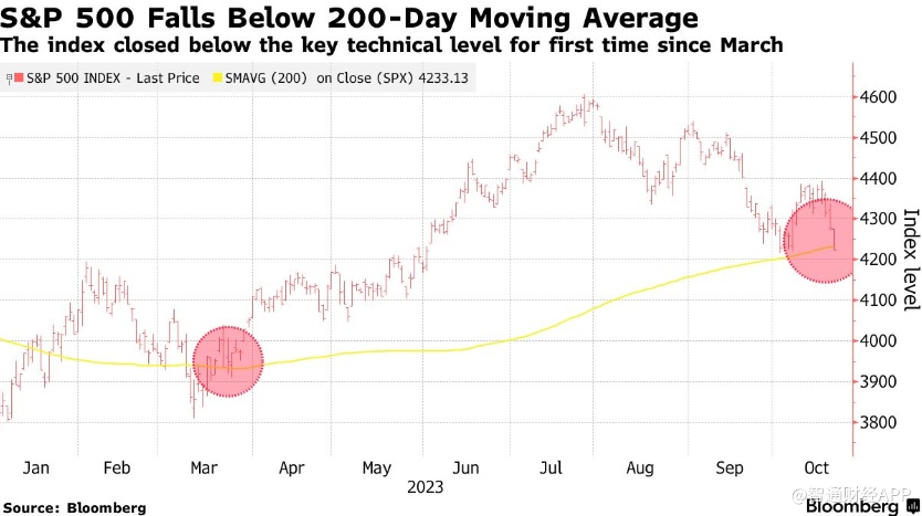 Wilson的悲观观点在一定程度上得到了证实,标普500指数连续第三个月下跌,因为市场担心利率会在更长时间内处于高位。上周五,该指数收于4224点,自3月以来首次跌破200日移动均线。这被认为是一个关键的技术支撑位,交易员用它来评估长期趋势是上升还是下降。