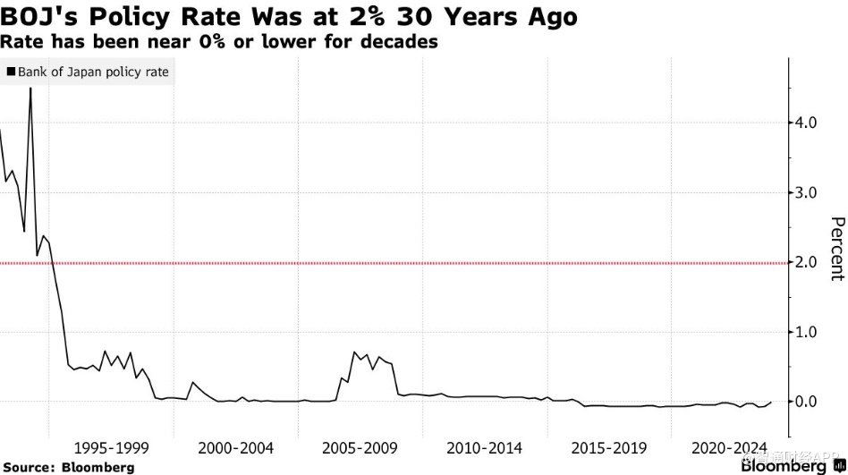 日本央行政策利率长期接近或低于0%