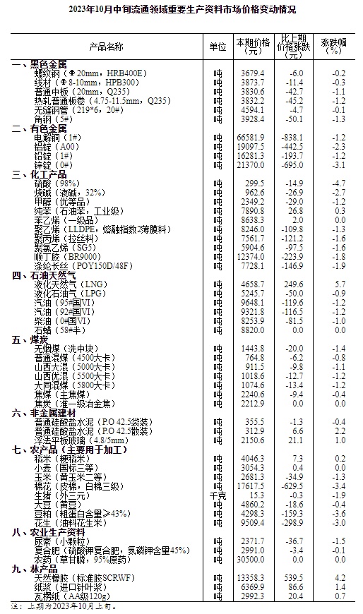 智通财经APP获悉,10月24日,国家统计局数据显示,据对全国流通领域9大类50种重要生产资料市场价格的监测显示,2023年10月中旬与10月上旬相比,8种产品价格上涨,37种下降,5种持平。其中,焦煤(主焦煤)价格与10月上旬相比下跌0.4%,达2240.6元/吨,焦炭(二级冶金焦)与此前持平。生猪(外三元:三种外国猪杂交的肉食猪)价格为15.3元/千克,跌1.9%。此外,硫酸(98%)价格较10月上旬下跌14.9元/吨,本期价格为299.5元/吨,跌幅达4.7%。
