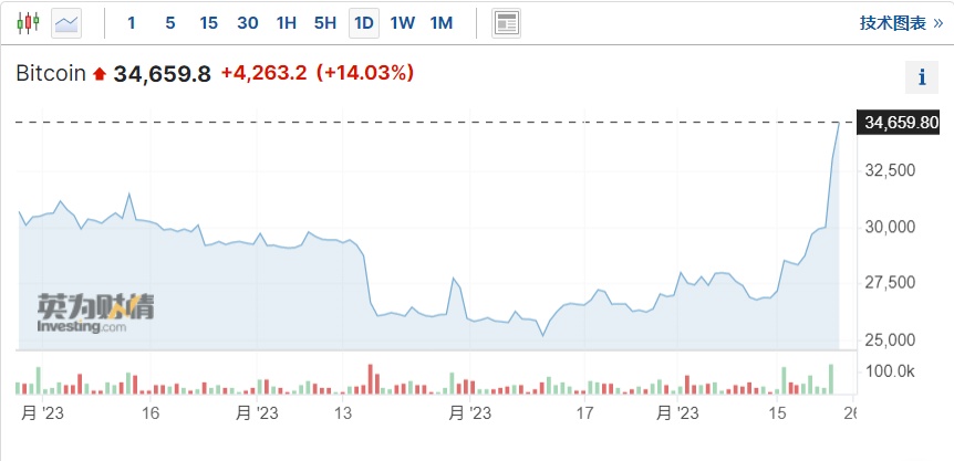 智通财经APP获悉,随着投资者对基于比特币现货ETF的获批前景越发感到兴奋,周二亚市期间,比特币价格继续扩大涨幅。截至发稿,比特币上涨逾14%,至一年多来的最高点34659.8美元。