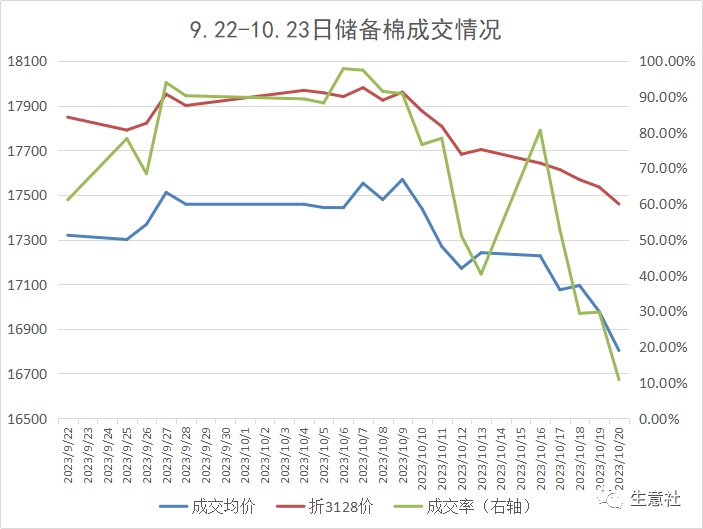 10月16日-10月20日储备棉销售第十一周,合计上市储备棉资源10万吨,总成交4.06万吨,成交率40.63%。平均成交价格17109元/吨,折3128价格17598元/吨。储备棉销售成交率整体呈现下滑态势,从周一的80.57%迅速滑落至周五的10.82%,主要原因是新棉产量逐渐明确、国内需求未见好转、郑棉价格持续下跌和长期销售储备棉的纺企库存相对充足,纺企参与热情进一步降低。