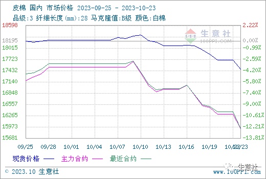 智通财经APP获悉,生意社发布数据显示,近期国内外棉花行情承压下跌,国内方面新棉抢收预期证伪,收购市场降温,储备棉成交率持续下跌,需求端难言好转,重重利空叠加下现期货行情均跌幅较大。据生意社商品行情分析系统,10月23日3128B级皮棉现货价格在17465元/吨,周跌幅在3.42%,较月初下跌4.14%。郑棉行情跌幅扩大,跌破万六大关,截至23日,郑棉主力合约结算价15925,周跌幅在6.63%。