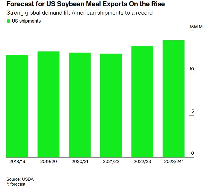 预测数据显示,美国农业部预计2023-2024年度美国豆粕出口量将达到1390万吨,豆粕这一成分主要是在压榨全大豆的过程中与油一起制成。如果这一数据达到,将超过截至9月份创纪录价值近70亿美元的1320万吨豆粕。