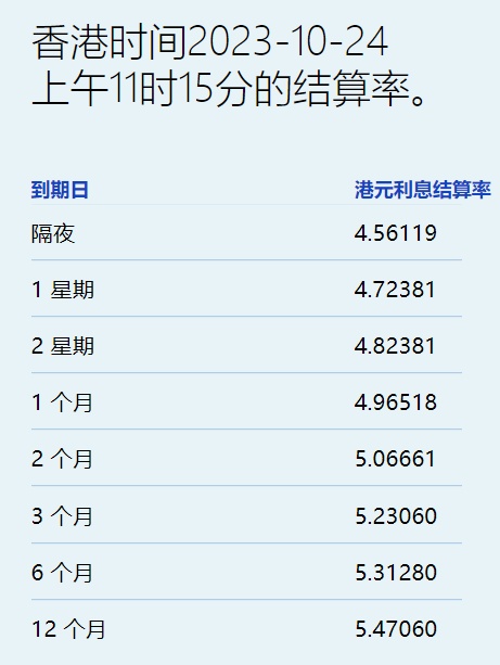 智通财经APP获悉,重阳长假后、施政报告发表前夕,10月24日,港元拆息全线上升,其中,隔夜息升至4.56119%,而与楼按相关的一个月拆息亦连升两天报4.96518%,两者齐创一周新高。反映银行资金成本的三个月拆息微升至5.23060%,见近一周新高,与同期美元LIBOR息差收窄至43基点。长息方面,六个月期中止两连跌,报5.3128%,一年期报5.4706%。