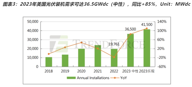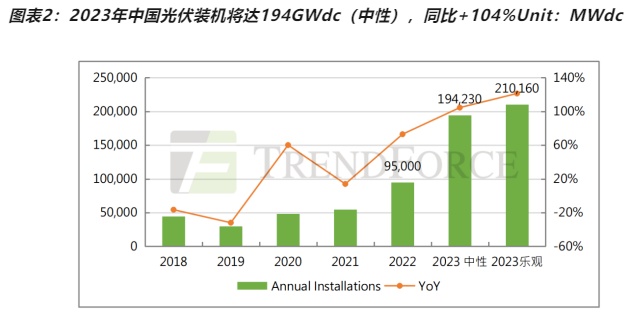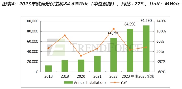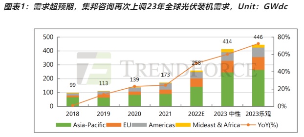 智通财经APP获悉,近期,集邦咨询发布研究报告称,推动碳中和已成为全球的共识,世界能源格局正在发生变化。随着可再生能源比重增加,光伏装机需求快速增长,全球光伏产业进入了旺盛发展周期。从全球市场来看,2023年全球整体光伏需求保持高增,集邦咨询旗下新能源研究中心集邦新能源网EnergyTrend预计2023年全球新增光伏装机中性预期将达到414GW,乐观预期将达446GW。从中国市场来看,集邦咨询预计2023年我国新增光伏装机将达194GWdc(中性预期),同比增长104%;美国方面,2023年美国光伏装机需求可达36.5GWdc(中性预期),同比增长85%;欧洲方面,2023年欧洲光伏装机84.6GWdc(中性预期),同比+27%。