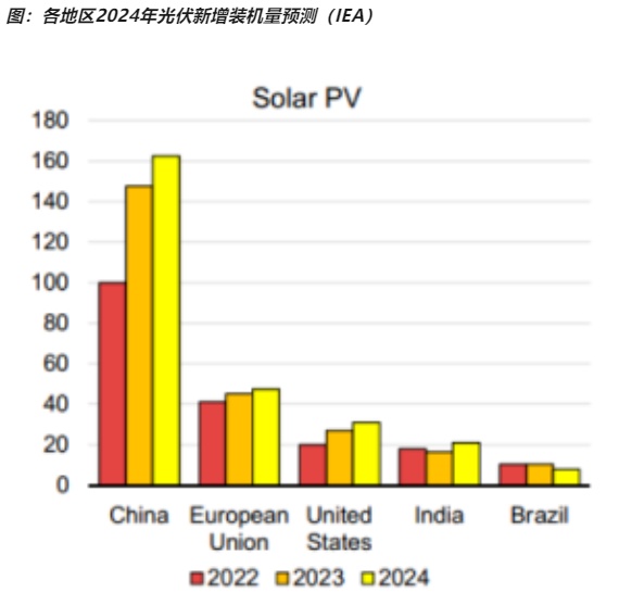 国际能源署(IEA)近期发布2023-2024年新能源市场预测展望,预计2024年将新增光伏装机310GW。全球光伏装机需求仍维持在高位,在多国相继加速推动碳中和目标实现的背景下,叠加能源转型的大趋势,海外光伏市场规模仍将保持增长。除了主要区域市场之外,新兴市场需求潜力巨大。