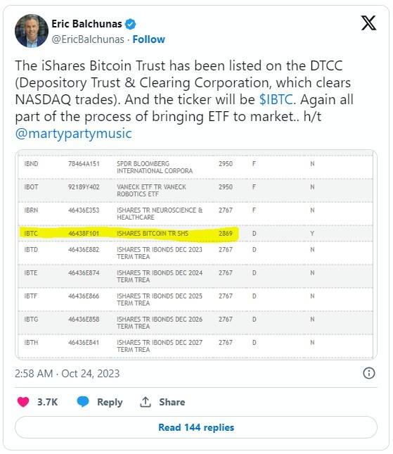 来自Bloomberg Intelligence的ETF分析师Eric Balchunas在X平台(前身为推特)上指出,iShares比特币信托已在DTCC上市,代码为“IBTC”。