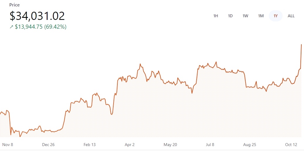 智通财经APP获悉,加密货币交易员们热切期望首只美国现货比特币ETF正式获得监管批准,因此比特币今日延续了在现货交易所交易基金(ETF)需求预期推动下的涨势,达到自2022年5月以来的最高价格。最新数据显示,全球最大市值加密货币——比特币涨幅一度高达11.5%,至3.5万美元上方。即使近期有着“全球资产定价之锚”称号的10年期美债收益率升破5%,达到2007年以来新高,比特币看涨行情仍然独立于股票、债券等主流风险资产,走出强势上涨的独立行情,而股票等资产近期全线下跌。