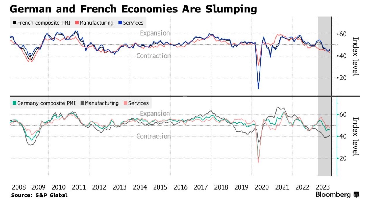 智通财经APP获悉,法国和德国经济在第四季度初开局不佳,原因是私营部门活动持续萎缩,需求疲弱,以及借贷成本攀升。标普全球(S&P Global)在这两个国家的商业调查数据显示,PMI仍远低于50的水平,而50是经济扩张与否的分水岭。10月份制造业和服务业PMI均出现萎缩,而劳动力市场这个此前为数不多的亮点也出现了进一步的疲软。