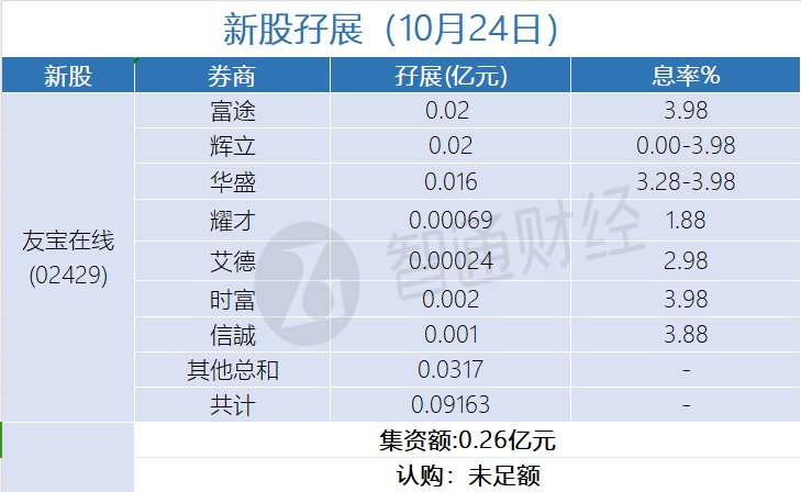 智通财经APP获悉,友宝在线(02429)正在招股中。截至10月24日,富途、辉立等券商合计为友宝在线借出孖展0.09163亿港元,认购未足额。