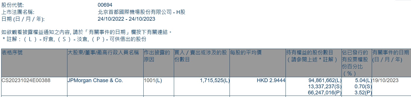智通财经APP获悉,香港联交所最新资料显示,10月19日,小摩增持北京首都机场(00694)171.5525万股,每股作价2.9444港元,总金额约为505.12万港元。增持后最新持股数目约为9486.17万股,最新持股比例为5.04%。