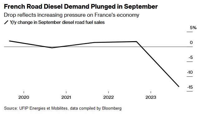 智通财经APP获悉,法国9月柴油需求明显下降,表明这个欧盟第二大经济体正面临越来越大的压力。行业数据显示,今年9月,法国柴油销量较上年同期下降了13%,这是近几个月以来的最大同比降幅。对运输和工业部门至关重要的柴油类燃料的需求往往是经济活动的风向标。咨询公司Wood Mackenzie的研究分析师Emma Howsham表示:“法国柴油需求的急剧下降反映出法国经济面临的压力越来越大,工业活动和货物运输也在放缓。”