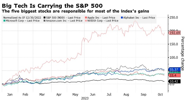 标普500指数中最大的五家公司(均为科技股)贡献了该指数今年10%的涨幅。再加上特斯拉(TSLA.US)和Meta Platforms(META.US)等其他几家重量级科技公司,就几乎带来了该指数今年的全部涨幅。美国银行上周对基金经理的调查显示,押注大型科技公司进一步上涨被视为最拥挤的交易。
