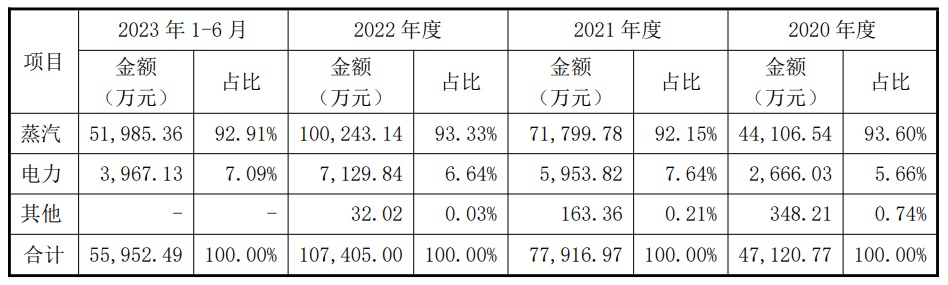 公司的第一台热电联产发电机组于 2019 年正式并网投产,目前已在泗阳、曹县两个园区内实现了热电联产发电上网。报告期内公司蒸汽与电力在主营业务收入中的占比情况如下表所示: