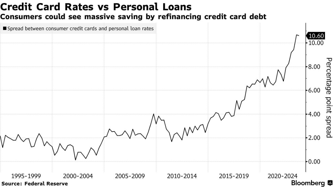 智通财经APP获悉,美国信用卡利率与个人贷款利率之差正徘徊在有记录以来的最高水平附近,这意味着消费者可以通过转移信用卡债务节省大量利息。