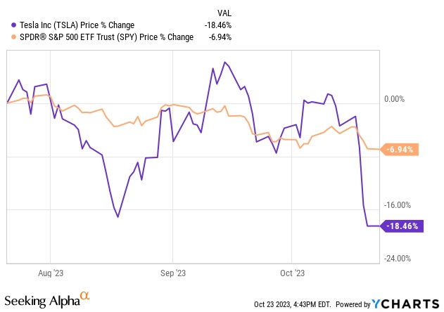 下图概述了特斯拉过去三个月相对于标准普尔500指数的表现。