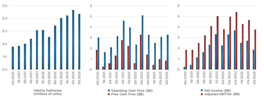 对利润率缩水的预测也已经开始显现,该公司本季度的营业利润率为7.6%。下图概述了截至23年第三季度特斯拉的汽车交付量、运营现金流和净收入。