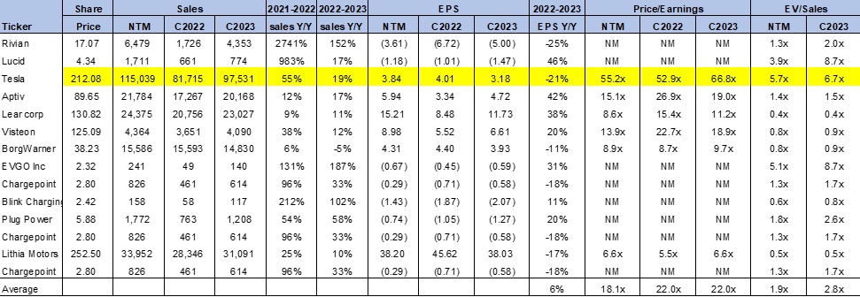 特斯拉的股价高于同行平均水平,鉴于特斯拉在电动汽车市场相对于同行的地位,较高的市盈率是合理的。以市盈率计算,该股交易价格为66.8倍,每股收益3.18美元,而同行平均水平为22.0倍。该股的EV/C2023年销售额为6.7倍,而同行平均水平为2.8倍。