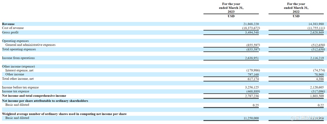 据最新招股书数据,明成集团在截至2023年3月31日的12个月内录得营收约为2187万美元,相较去年同期的1438万美元大幅增长了52%;净利润则从180万美元增长了55%至279万美元。