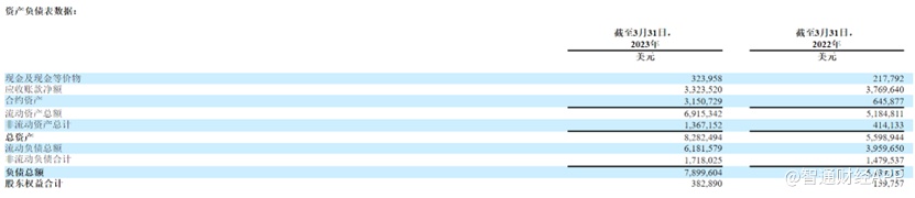 而在财务状况方面,尽管公司现金及现金等价物从去年同期的21.78万美元增长至32.4万美元,流动负债总额却录得更加显著的增加,从395.97万美元增长约56%至618.16万美元。截至2023年3月31日,公司未偿还的银行借款为532.21万美元,其中一年内需偿还的银行借款为382.36万美元。