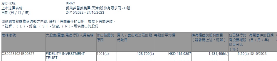 智通财经APP获悉,香港联交所最新资料显示,10月18日,FIDELITY INVESTMENT TRUST增持凯莱英(06821)12.87万股,每股作价115.0357港元,总金额约为1480.51万港元。增持后最新持股数目为约143.15万股,最新持股比例为5.20%。