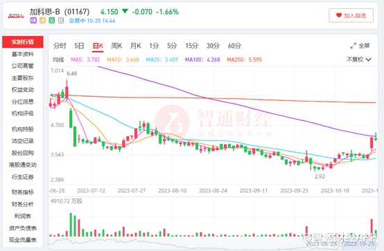 受此消息的影响,10月24日,加科思股价大涨19.21%,不过次日并没有延续大涨的行情,而是冲高回落,截至收盘时间,公司股价跌4.27%,报4.04港元/股,成交额4007万港元。