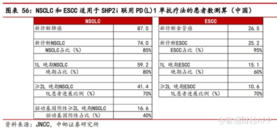 从联合疗法角度来看,作为一款辅助用药,基于SHP2靶点在激活RAS蛋白和执行PD1信号通路上的功能,因此SHP2抑制剂联合PD(L)1单抗/KRASG12C抑制剂被业界高度认可。中邮证券认为SHP2抑制剂与 PD(L)1 单抗联用治疗非小细胞肺癌(NSCLC)和食管鳞癌(ESCC)两个主要适应症。参考JNCC数据,2021年中国新发NSCLC和ESCC数量分别为74.0万和25.2万,适用于SHP2i联用PD(L)1的2L驱动基因阴性晚期NSCLC和2L晚期 ESCC患者数量分别为16.6万和10.6万人,合计27.2万人。按20%渗透率,年费用10万元计算,SHP2抑制剂在三个主要适应症的潜在市场为54.4亿元。
