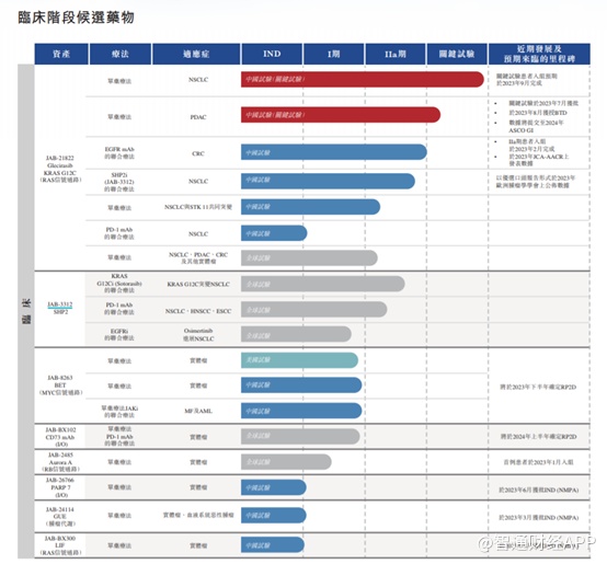 从研发管线角度来看,格来雷塞是加科思研发进展最快的产品。目前格来雷塞3项适应症均在推进中,其中针对非小细胞肺癌这一适应症中国关键注册临床预计今年9月完成入组,2024H1提交NDA申请,进度依然保持国内前三;联用利妥昔单抗治疗后线CRC数据于JCA-AACR 2023发表,进度国内第一,ORR 62.8%优于海外竞品,PFS数据值得关注;今年8月获CDE授予治疗2L+胰腺癌的突破性疗法认定,预计今年9月启动中国关键注册临床,胰腺癌早期数据预计将在2024年1月的ASCO GI发表。