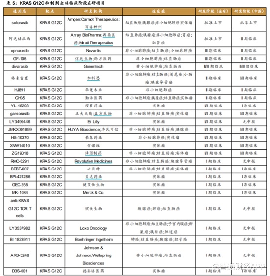 从竞争角度来看,全球处于临床阶段的KRAS G12C抑制剂共25款,其中批准上市2款,III期临床2款,II/III期临床1款,II期临床3款,I/II期临床7款,I期临床10款。中国处于临床阶段的KRAS G12C 抑制剂共18款,III期临床3款,II/III期临床1款,II期临床2款,I/II期临床6款,I期临床6款。