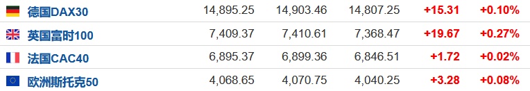 2.截至发稿,德国DAX指数涨0.10%,英国富时100指数涨0.27%,法国CAC40指数涨0.02%,欧洲斯托克50指数涨0.08%。