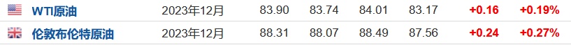 3.截至发稿,WTI原油涨0.19%,报83.90美元/桶。布伦特原油涨0.27%,报88.31美元/桶。