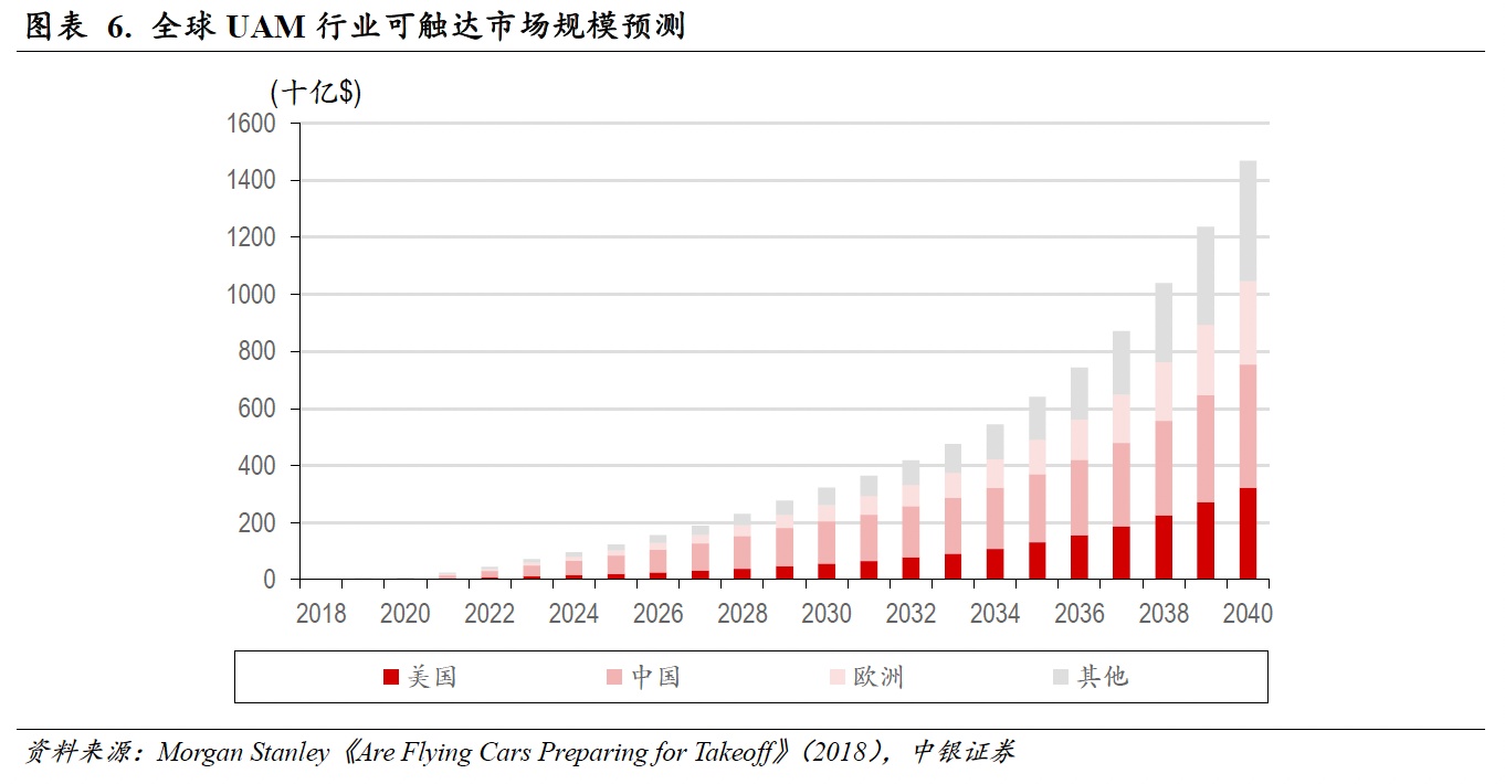 第三方机构的研究报告亦印证了这一点,根据摩根士丹利的测算,至2040年全球UAM(城市空中交通)的市场规模有望达到1万亿美元。