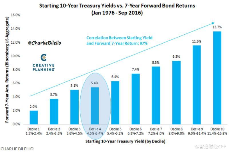 正如策略师Charlie Bilello的绘制的下图所示,当收益率约为5%时,投资者在未来七年内可以期望获得5.4%的年化总回报。