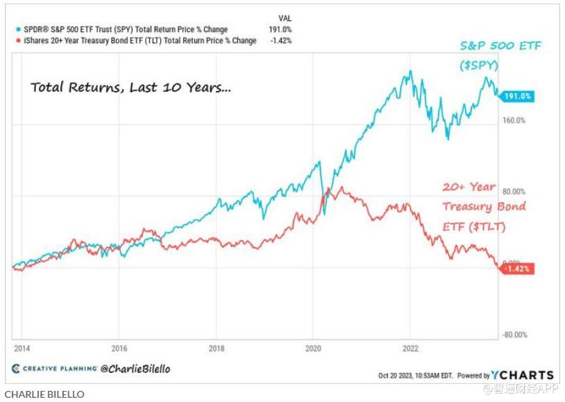 在2008年金融危机后的几年里,极低的利率创造了一个现象,即股票是无可替代的投资品,这帮助激发了一个长达十年的牛市,从2009年3月开始直到2020年3月新冠疫情全面爆发。在过去的10年中,标普500指数的总回报率增长了190%,而TLT下跌超过1%。Bilello将这描述为债券“失落的十年”。