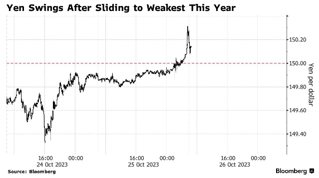 随着美国国债的再次暴跌扩大了与日本的收益率差距,周三纽约汇市收盘时,日元兑美元报150.23日元,这是1990年8月以来的最高水平。这使美元处于去年10月触及的盘中低点151.95美元的区间内,当时日本政府买入日元以遏制损失。