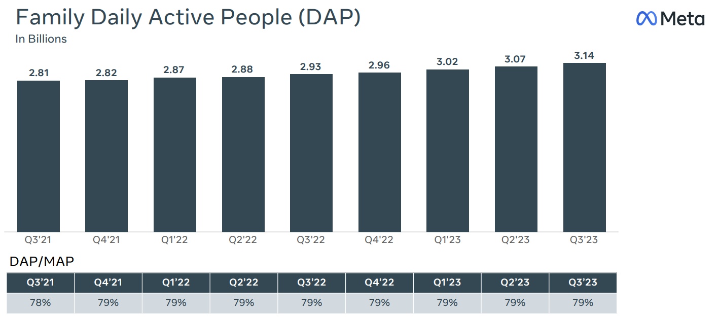用户数量方面,在第三季度,Meta家族应用软件(包括Facebook、Instagram以及WhatsApp等)每日活跃总用户数量增长了7%,至31.4亿,而分析师平均预期则为30.5亿。在9月,Meta首次向旗下应用的超30亿用户推出了生成式人工智能功能,此举可能将进一步刺激用户规模增长。